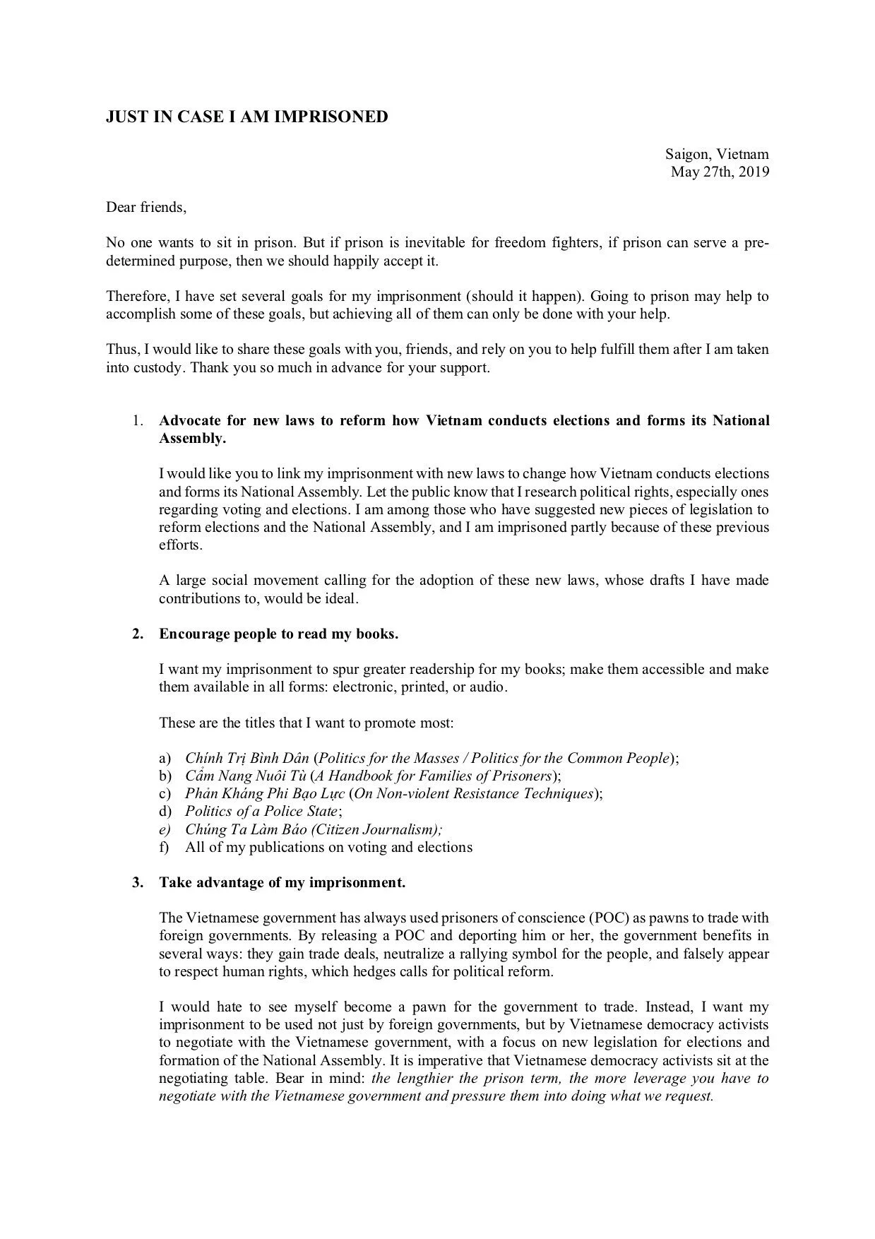 Den 7 oktober genomförde Hanoipolisen tillsammans med säkerhetstjänsten en räd mot den kända vietnamesiska författaren, journalisten och demokratiaktivisten Pham Doan Trang. Hon fördes iväg från sitt hem i Ho Chi Minh City, anklagad för statsfientlig verksamhet, ett brott som kan leda till 20 års fängelse.