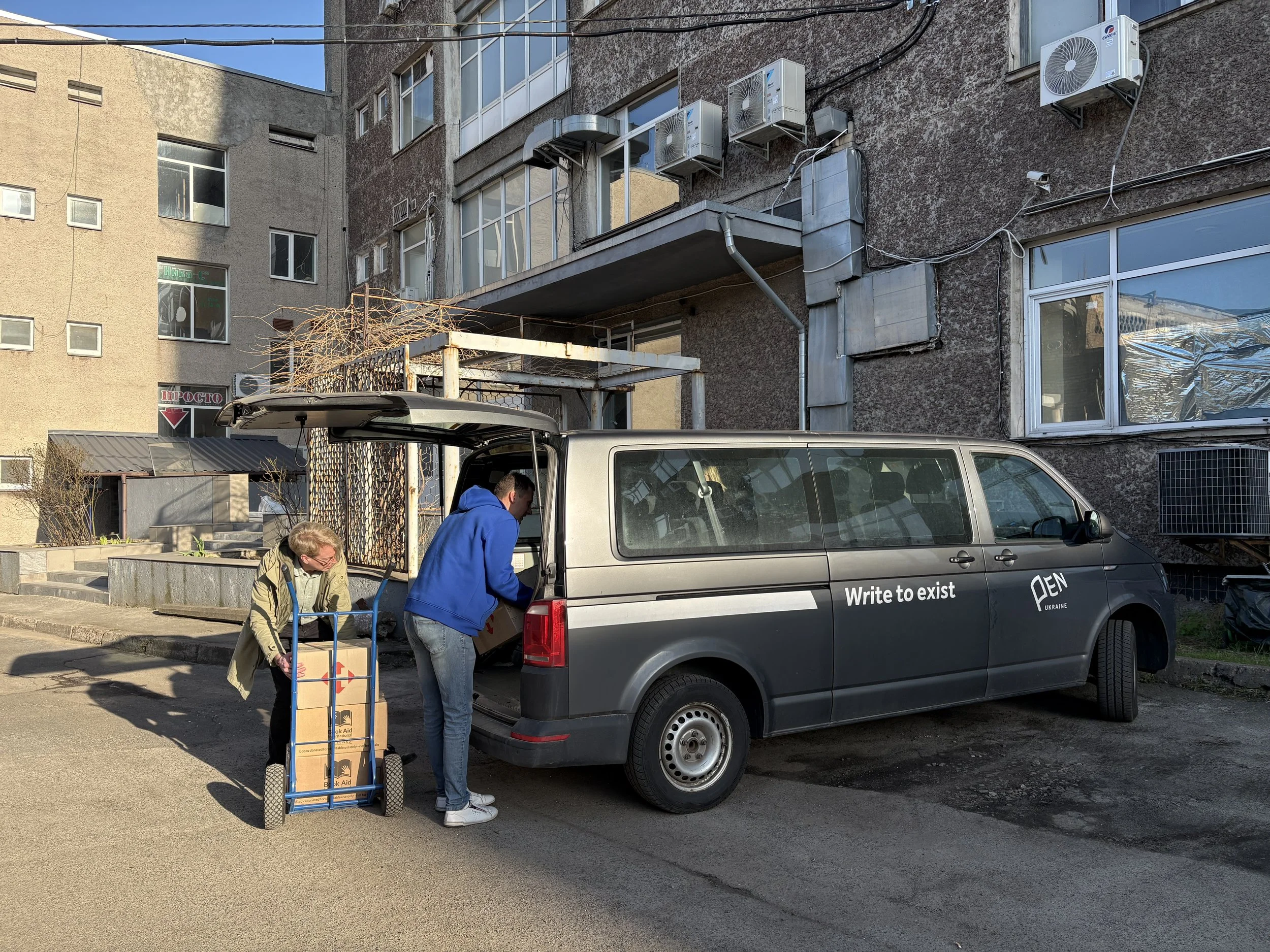 PEN Ukrainas minibuss packas med böcker för att köras ut till bibliotek nära fronten.